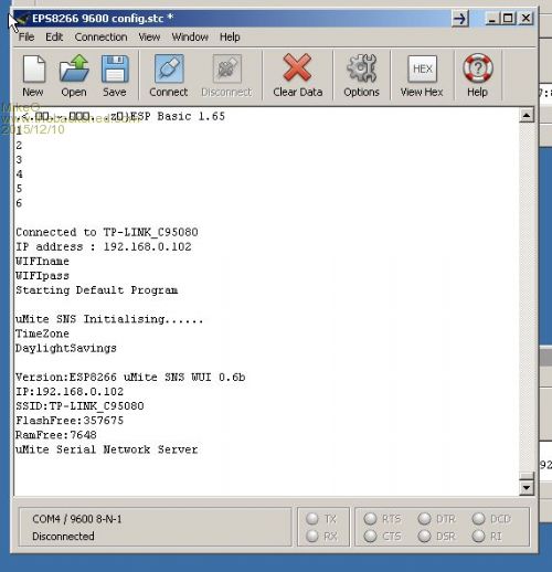 Hi Jim, I am assuming you are using an ESP01x style ? If so you would be programming the ESP8266 with ESPBasic via a Serial adapter from the Flasher software. If so this is the way I would suggest you proceed initially, instead of using the ESPflasher software use a comms program like Teraterm to talk directly to the ESP while you get familiar with the operation of the software in the ESP. Personally I use a program called CoolTerm as its very easy to control the comm port and also it has the ability to make up "SendString" windows that you can choose at will to send to the ESP. See my previous post on this. So to recap. Connect up your ESP8266 via serial adapter, in boot mode program the module with ESP Basic 1.65 or greater. Remove the boot mode link Restart the module with the terminal program connected set up at 9600 baud. After it has started up program with the uMite WUI software. If you have not previously setup network connection (ie you are still using AP mode) you can enable line 5 in the program with your network details. 'connect "Network" "password" "IP"" "gateway" "mask" , you don't need to fill in the last three fields unless you are using a static address, then when the software runs it will set up your new network connection. Run the software. If all your hardware it set correctly you should see all the boot up and initializing messages on your terminal. Like this...