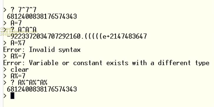 I was just explaining the discrepancy in your results a=7 sets a as a float unless you have "option default integer" set, whereas 7^7^7 interprets 7 as an integer as there is no decimal point print 7.0^7.0^7.0 gives your error which is one for Geoff to see if he can trap the overflow |