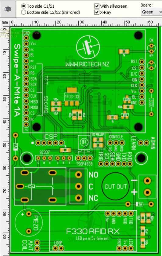 The system uses a 1.8" LCD for a display, and has a 10A relay for switching a door strike or maglock. Piezo sound output, serial and I2C outputs if needed for controlling external equipment, and a trigger line. IR remote control interface for the admin mode, so you can easily and painlessly learn in new tags and delete old ones etc. This is achieved by swiping a master tag or card which has the admin access rights. This is programmed in by shorting the ADMIN LEARN jumper. The system otherwise ignores the remote control.