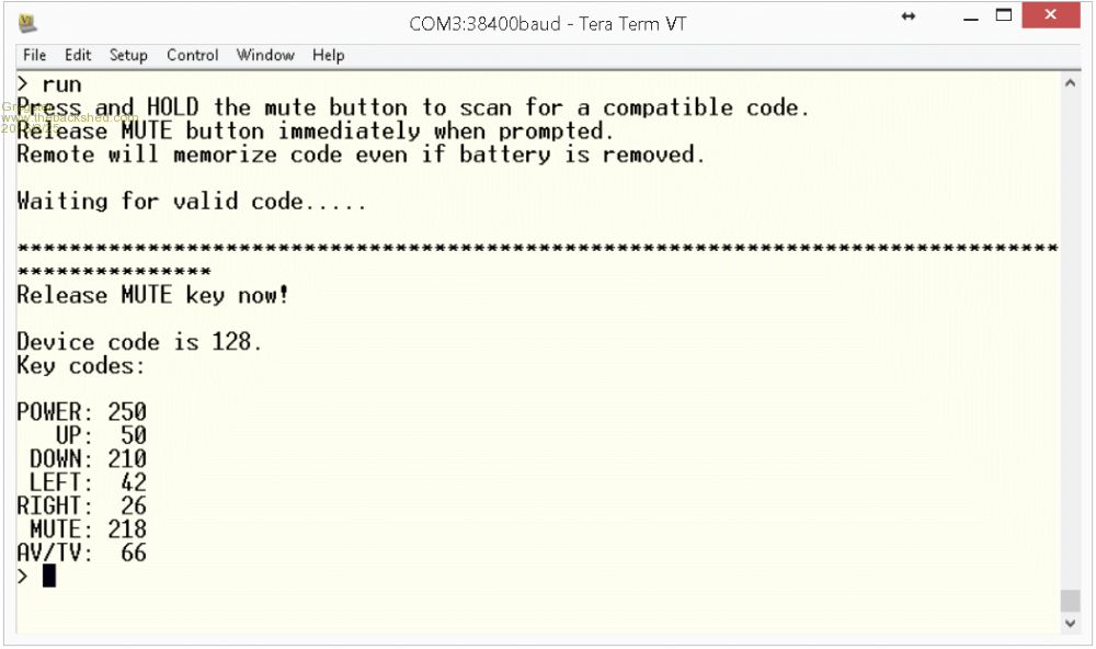 They are a universal remote designed for TV use, and thus, they can output many different codes. In my case, I found a device code and keycode combination that seems to work well, and then wrote a very simple code to allow you to search for the correct settings in the remote, without having a TV set to experiment on.
