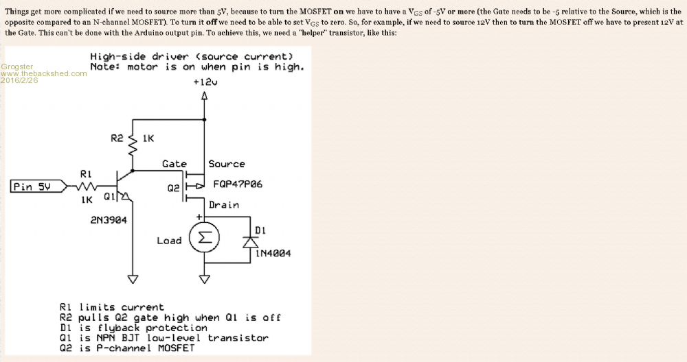 Low-side N-channel MOSFET switching is dead easy, but high-side P-channel switching almost always needs a blower transistor to help the gate along.