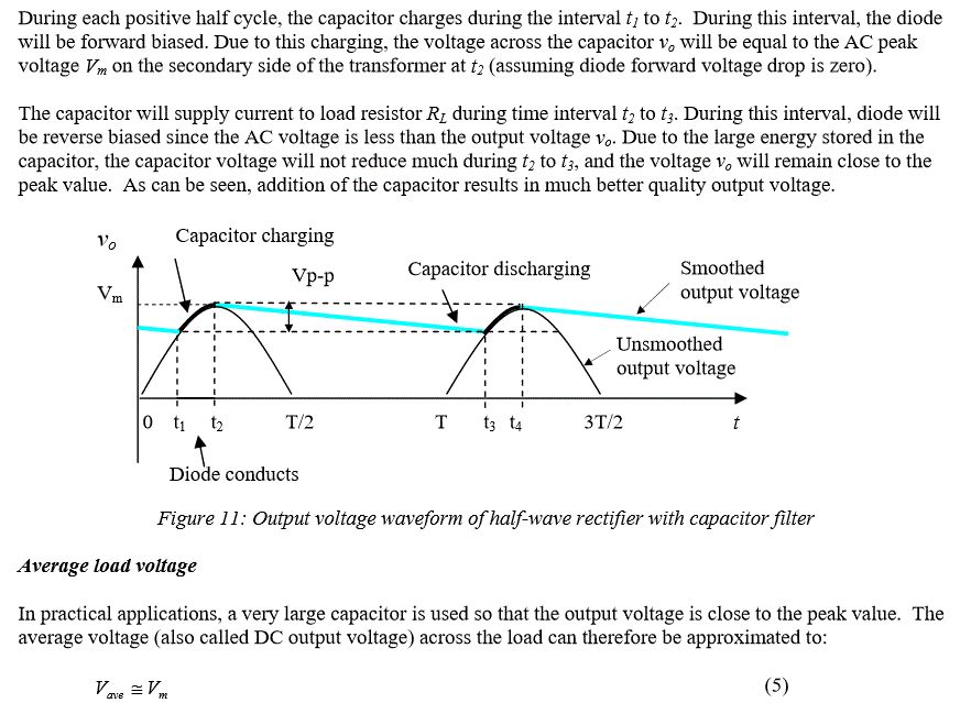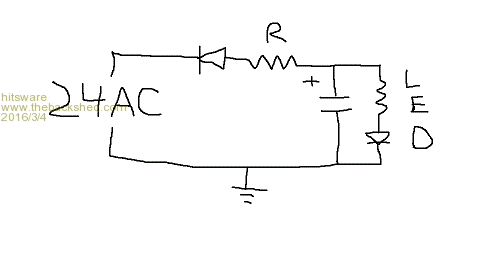 Hitsware, Your graph and accompanying text amplifies on what I stated before. With adequate capacitance the filtered DC output (Vm) will be about 34 volts with varying degrees of ripple. There are also design charts available that show that amount of ripple specifically (normalized values) for different loadings. Even with just raw full-wave rectified DC (no filtering at all), the voltage will be *above 24 volts* half the time, maxing out at 34 volts at the peaks. So it's hard to not get 24 volts or above from a 24 volt RMS AC source. With adequately filtered DC, it all the time above 24 volts; with raw full-wave unfiltered DC it's above 24 volts half the time. In your diagram resistance R should be removed because it could interfere with the quick charging of the cap to peak voltage (a small resistance R could be retained to limit inrush current when the power supply is switched on). The un-named resistor will serve to limit LED current. MM_W, could you tell us how much total current the LEDs use? I see where you might have already settled on a circuit, but this will be instructive. Hank |