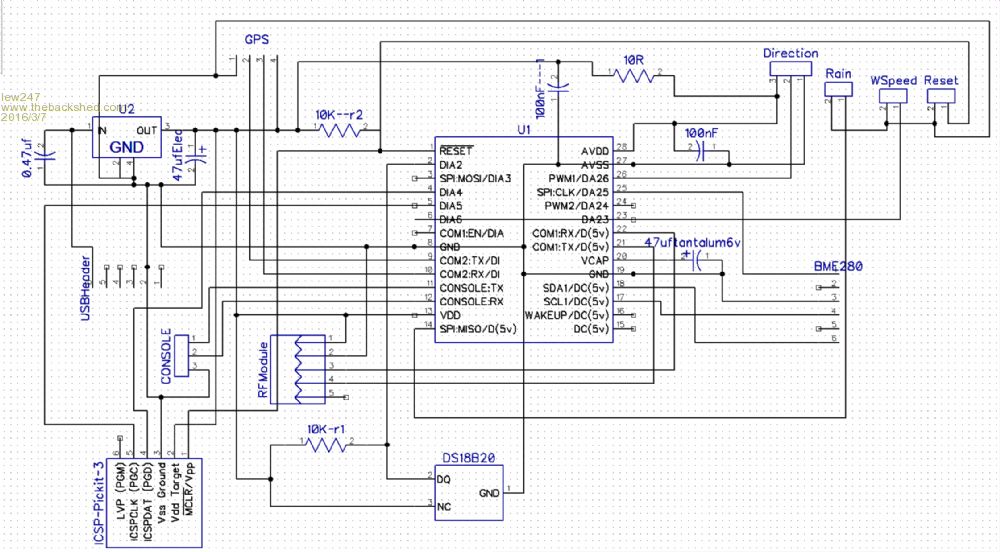 I'm "trying" to build a weather station, and over the weekend I put together a circuit for the outside unit composed of a 28 pin Micromite, Novalynx wind speed and direction unit, a BMP280 for Humidity and pressure, a DS18B20 for temperature (its more accurate then the BMP280) a GPS unit for time syncing and HC-12 433Mhz tx/rx unit to send the data indoors I'm going to be powering it from a micro usb port connected to a 5V 5A battery with usb socket and solar charging built into it. In the circuit I've put everything on headers including the console connector (for ease) so they can easily be replaced if need be, and the inputs from the direction, wind and rain sensor and reset are on screw terminals Could someone look over the circuit and see if I've made any stupid "newbie" mistakes with either the wrong pins, power or ground to the wrong places, comsole or rf tx unit being connected the wrong way round. I'd be very pleased if someone could look and let me know of any errors I did the circuit using diptrace, but couldn't find the components I wanted for everything so it might look a bit weird. I'm going to see if I can find someone online who "once the circuit is right" can turn it into a pcb layout, I'll probably use www.fiver.com I know I could try and do it myself with diptrace, but I spent all weekend trying and always ended up with it looking rubbish and several components needing jumpers, as I have no idea how to do a 2 sided board, it was hard enough learning how to make it one sided Thanks 2016-03-07_175356_Weather.zip I uploaded the Diptrace file but here's a picture of it |