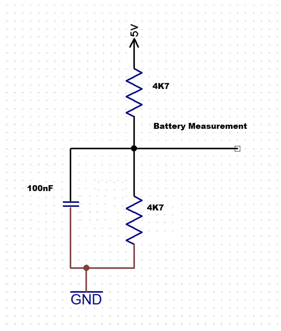 Is the circuit below sufficient to measure voltage on a micromite? The battery I want to measure is a 5V battery. I'm as assuming (hoping) the ADC will be measuring 0-2.5V? Will the resistors drain the battery? ie if I expect the battery to last for a very long time without the circuit will it take much from the battery? |