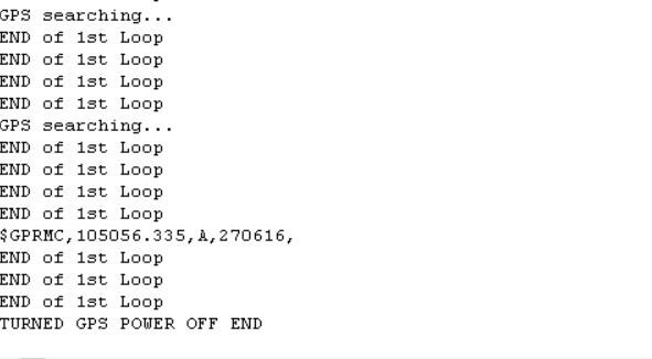 WW Do PRINT "1: ",str$(secs) Do while secs < 20 PRINT "2: ",str$(secs) GetGPSData ' get the next line 'Print "RETURNED FROM GetGPSData" IF arg$(0) = "GPRMC" THEN ' GPRMC contains lat/long IF arg$(2) = "A" THEN ' "A" means locked on to satellites PRINT "$"arg$(0)"," arg$(1)"," arg$(2)"," arg$(9)"," 'Print Time and Date ELSE PRINT "GPS searching..." ENDIF ENDIF Print "END of 1st Loop" PRINT "3: ",str$(secs) if secs = 15 then 'after 4 minutes PIN(23) = 1 'GPS Power OFF print "TURNED GPS POWER OFF END" END IF Loop PRINT "4: ",str$(secs) print "got to 2nd Loop" loop end |