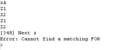 Why would a "FOR" statement not register? a section of code (the prints are there to test where it fails) [code] For z=1 To 10 'addup all data in array print "Z1" wResult=wResult+wArray(z) print "Z2" Next z [/code] result is its adding the array up as I can see by the zA, Z1 and Z2 prints but when it gets to next z if think's there's no "FOR" EDIT: I only get this if I put the "turn gps on section" into a subroutine and not when it's in the main program loop The section it fails on is nothing to do with the gps at all, it only goes to that section after the gps is turned off |