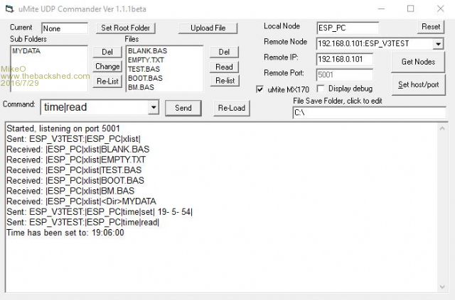 This Windows network utility allows you to talk to both the variety of Micromites MX170 and Plus, lets you access the file and folder structure of the SD card, read and write text files, save and load program files. Transfer rate is around 60K file per min. It also provides Time update, remote restart of hardware and remote upload of program file and restart of system. The MX170 uses the excellent SD card drivers from matherp. There are three parts to the system ,firmware for the ESP8266 (running ESPbasic Ver3.08) Micromite firmware and of course the Windows Utility (tested on XP to Windows10) The Micromite firmware resides in the Library area (including the SDcard drivers for the MX170) occupying a total of 16K in the case of the MX170 , less for the Plus as there are no drivers needed. A small portion of code resides in the main program area where it is integrated into the users host program. The Utility and code is available here Codenquilts |