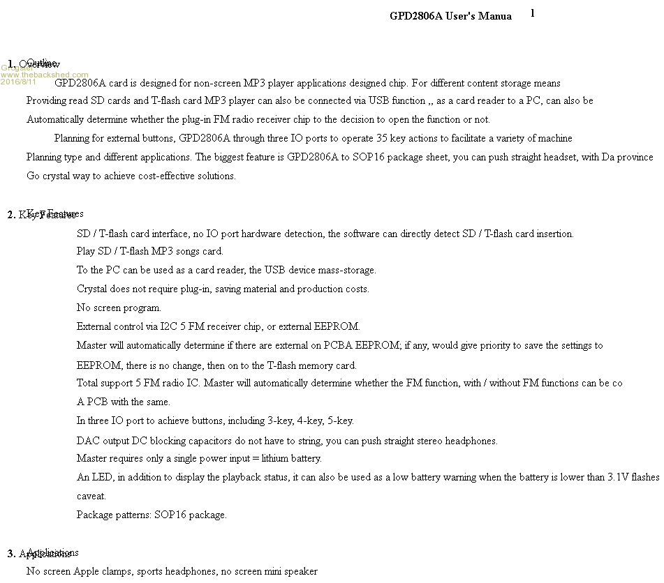 The module uses the GPD2806 MP3 decoder chip which is only a 16-pin SOIC which is quite amazing that it is not something in a denser pin-pitch package with more pins then that! But in that package, they get the MP3 decoder, the SD card handling, the button control and even provision for an external FM radio IC too - quite astounding, really, considering it's footprint, pin-count and cost of the module. The manual I have linked to above is in Chinese - you need to run it through Google Translate to make any real sense of it(unless you can read Chinese), but the diagrams and charts are still useful to have. The main page of the PDF reads as: