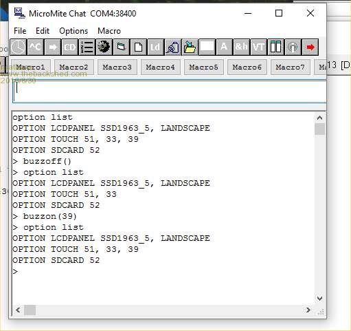 I get buzzed() to 'switch off' pin 39 from OPTION LIST (as in your screen-shot above), but buzzon(39) restarts the MM every time. This occurs both at prompt and in code. Triple checked everything. CPU is at 100. v5.2 (as per Geoff's website). My pins/OPTIONS are slightly different to yours as follows: DISPLAY 24, 66 LCDPANEL SSD1963_7, LANDSCAPE, 48 TOUCH 1, 40, (39) KEYBOARD UK SDCARD 47 LCDPANEL CONSOLE RTC 67, 66 |