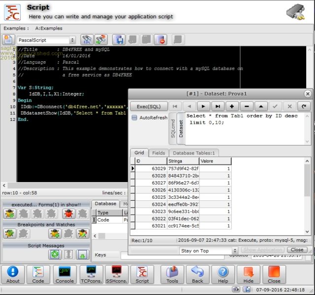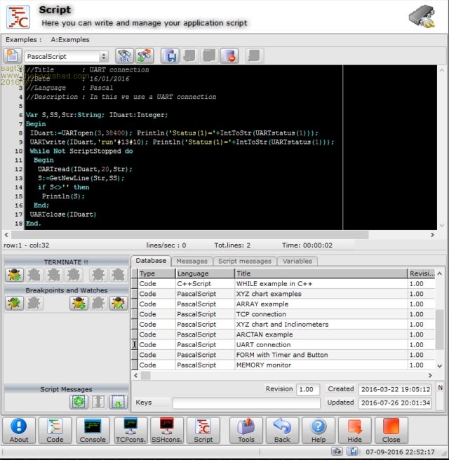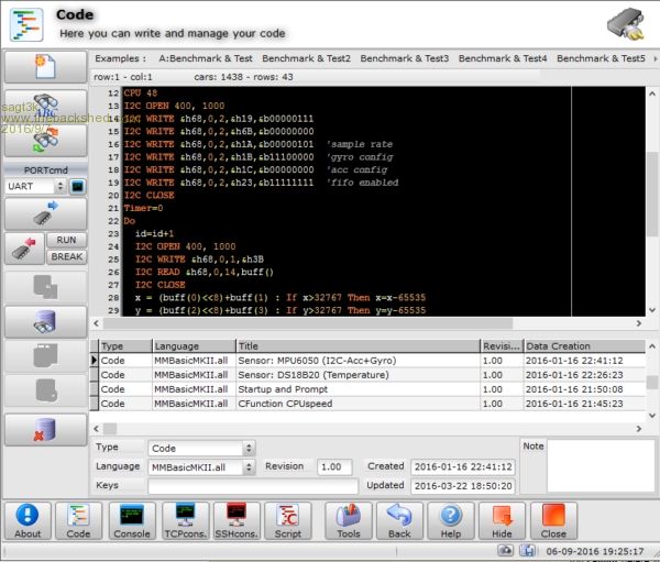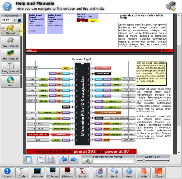 Hello to everybody In this post I want to show some pictures of the new software that I'm going to present soon. Here a list of some features and images: - software is portable and run with all windows win32/64, WinXP/Vista//7/8.x/10 - integrated editor compatible with MMBasic - not require installation and all the code is compress and encrypted in a single data file - integrated console UART/USB and TCP/IP, all compatible with VT100 standard and MMBasic/Editor MKII - it is possible to put any console COMx port to TCPserver:port - it is possible to put any console TCP/port to another TCPserver:port - infinite possibilities of connection and management also with multiple ports - scripting engine in 4 languages (Basic,C,Pascal and JavaScript) with RUN and DEBUG function - hundreds of functions created to manage both UART and TCP ports with the rest of the world - through scripts and integrated laboratory modules it possibile, for example to interact MICROMITE with MySQL database, DWEET.IO, MS-SQL, CLOUD service, with files on the PC, CHARTS , excel files etc. At present the software is at 90% completed and now I'm writing manuals and thousands of interactive tutorials. You are well accepted for tips and more etc. Thanks to Geoff for the great job.