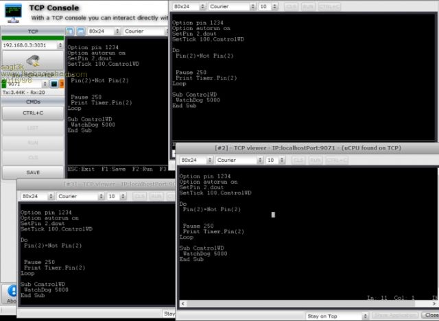 Hi Chris The SW is optimazed to interact in UART or TCP mode with all key sequence of Micromite. I can have COMx with a Micromite and other multiple console with TCP ports. In this example I have: PC(192.168.0.3)+UART COM3:+Micromite, I share COM3 on TCPport:3031 My PC(x.x.x.2) is connected in TCPconsole with 192.168.0.3:3031 My PC share again port TCP x.x.x.3:3031 with another port 9071 and I have create another 3 TCPconsole on 9071 ... Praticaly Micromite on UART3 on PC(x.x.x.3:3031) and (x.x.x.2) share (x.x.x.3:3031) and redirect all data on port 9071 and so on ... etc..and scripts could interact both UART that TCP indifferently.