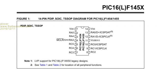 I Assume you mean power supply decoupling, pin 1 is GND and pin 14 is +5V, pin 2 is RA5 on this PIC. There is no power decoupling and I agree it would not hurt but I have no idea if it is required. Remember it appears to work fine but for the USB port gone on strike slowly. Good point about software and it is pointing towards a reload may be only chance. Later in the day I hope to get the oscilloscope connected. I have just looked up the USB section in the Maximite PIC32MX795F512L-80I/PF data and looked at the circuit diagram. This has a 1 K resistor ins eries with the USB v+ pin, wondering about the purpose for this. I was more interested in the D+/D- lines but they are direct connected as on the PIC16F1455. |