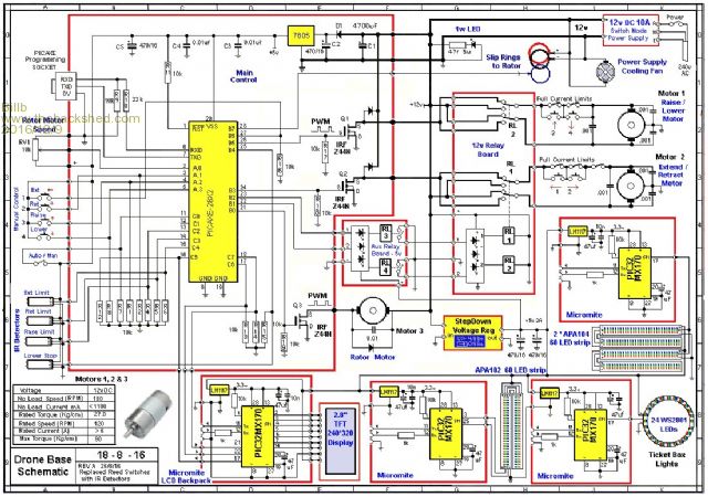 Hi and marry Christmas to all. Here is the latest video of my light display. The carnival is the main attraction that all the local children love. The new addition is the DRONE ride. This is controlled by a picaxe 28X2 as the main controller with a 14m2 controlling the operation of the seat rotation. Also there are four PIC32MX170s controlling the LCD and strip LED lights. One LCD backpack and 3 of BigMicks 170 boards. All up there are three high torque 12v motors and four worm drive motors for the seats. https://www.youtube.com/watch?v=XrBXMeq9stg&t=3s Shematics of the Drone ![]() ![]() Also the sign is new, this uses the 64 x 32 LED display and Peters RGB Driver. Bill In the interests of the environment, this post has been constructed entirely from recycled electrons. |