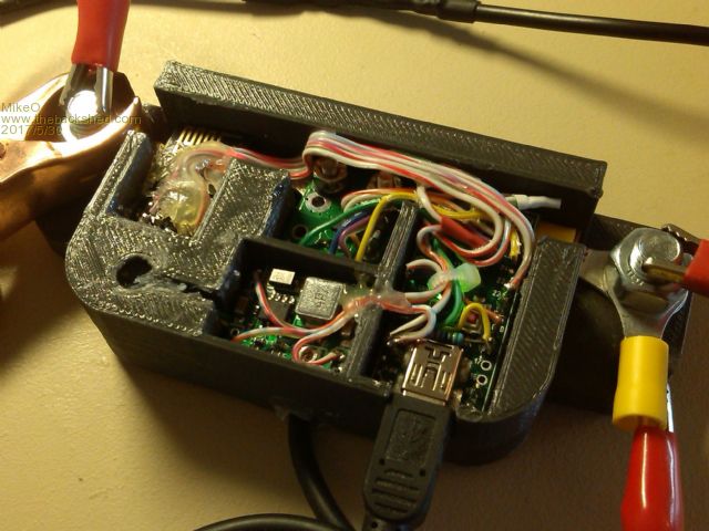 Photo shows 3D printed enclosure , Battery terminals, from left ESP8266 wifi, ASC711EX current sense, Explore 28,bottom left Temp sensor and DC to DC PSU.