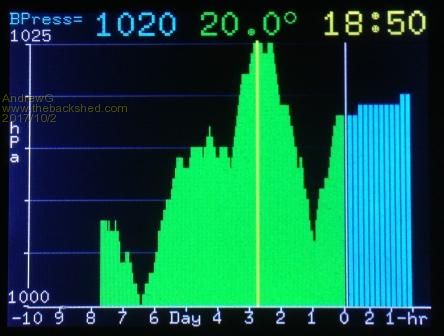 Hi Lew, Very nice work. If you look at this thread there are some pictures of my current project. The graph of barometric pressure may be of interest? ![]() I'm happy to share all the code etc. but it is probably more use if I extract out the bits you want (I'm a bit shy about how poor my code might be and I know of one error I should fix). As it is, it takes a BP reading every 15 minutes and plots these over the last 3 hours (3 pixels wide per reading, 1 gap between). Each of the 4, latest 15 min readings are averaged to give an hourly average which is plotted (1 pixel per hour, 24 per day wide) for the last 10 days. All the readings are stored in arrays so they can be shuffled each hour or day. This completely fills a 320x240 LCD Backpack but you could plot fewer days and use fewer pixels for the 1hr plots. To plot the readings it is quite easy: - draw the axes and label them (in White) - draw any background grid lines (in Gray) - use "Line" statements to draw the bars where X is set as its hour or day value, the Y1 value is the X axis (-1) and the Y2 value is the "BP reading" x "any scaling factor" to fit it in. For the 3 hourly plots I specify a line width of 3 and for the daily ones default to 1. Does this help? Andrew |