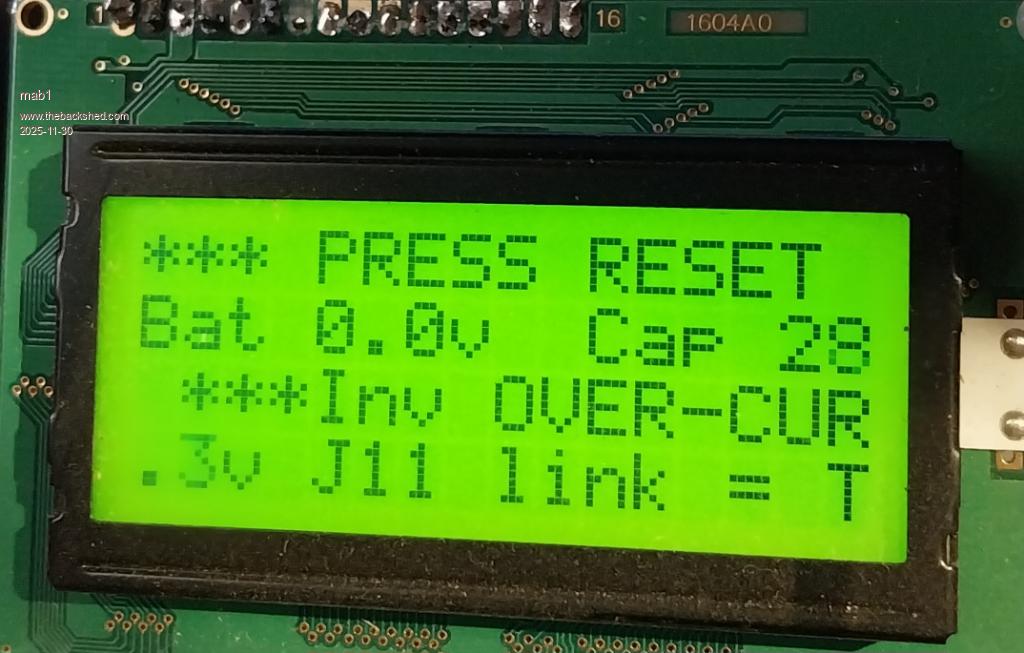 Update: The inverter has been working flawlessly for several months now Although I still haven't wound my big transformer yet .But I did have a curious failure of the nano module the other day: I'd turned the inverter off whilst doing some wiring on the feed to the changeover switch, and when I turned it on it was showing 0v for battery voltage, and the "battery low/inverter off" message on the display. With reference to the schematics, I traced the circuit from the on/off swt through the resistors and q10 to the A3 (Vbat) pin on the nano module and there was 2.5v on A3 as there should be, but still 0v on the display (Vcap was normal). So I dug out one of the three nanos I'd programmed with Mike's help, dusted it off and popped it in, and the inverters running normally again .But I am a bit at a loss as to why the nano A3 input would fail - even if the +48v and 'off' inputs to the WG39 board were somehow seeing something other than +48v and +48/0v, there are surely other components that would be hit 1st? There was zero load on the inverter when turned on and off. |