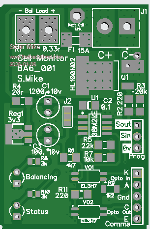 I have built a number of Lifepo4 and Lead Acid multi-cell battery balancers over the past several years, both passive and active types; they all work in various degrees, some better than others. Add to the mix accurate measurement of each cells voltage and the design gets more complicated. The passive types discharge a load resistor across any individual cell when its cell voltage goes above a high set point under charge, depending on the load resistor, quite a lot of heat can be generated, requiring a large heat sink and perhaps a fan. They do have the advantage that the load current is known and doesn't depend on the voltage difference between other cells. The active types using a large ferrite toroidal core with windings linked to each cell and synchronous current pulses work very well, however to get high load currents the circuit impedance must be in the mill-ohms region when cell voltage differences are low, reading the individual cell voltages is also tricky with all the voltage spikes. Under ideal conditions where cells are matched, balancing can be achieved with a couple of amps; cells I am using are re-cycled 100 - 400 AH and various ages - manufactures, so rather large load currents are required to keep "runner" cells in line. A passive balancer with a known load current works best here, this design is a modification of previous variants, where a mother board hosts individual cell module pcb's linked to each cell in the battery bank. A controller connects to one or two MB's allowing either 16 - 32 cell batteries. Cell boards each have their own cpu, here a very cheap Pixaxe 08M2LE and talk to the controller via opto-couplers for isolation. In the past I have used a form of PWM for cell communications, where the width of the pulse specifies the cell address and corresponding cell voltage in milli-volts, this is quite fast and should work ok on 32 cell banks. Here are the pcb's that will be sent off to be made in the next day or so, I will draw up the schematics when its all working and any bugs ironed out. Controller 100x100mm 4 layer: Can drive a couple of large DC relays for main contactor control and inverter pre-charge. ![]() Cell Board 33 x 50mm: The 3.3v regulator is only used when monitoring 6V lead battery cells. ![]() Mother Board 200x106mm: Large holes in the pcb are to allow air from a top mounted fan cool the 0.35r (10 amps) 50w resistors mounted below the main pcb, using a large alloy plate as heat sink. ![]() Cheers Mike Edited 2026-01-06 12:57 by Solar Mike |