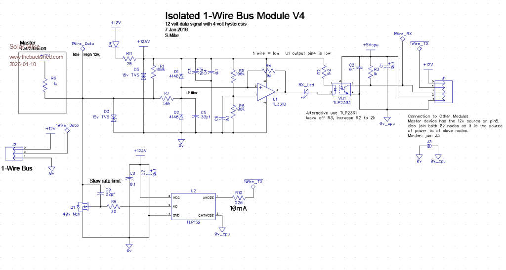 The 1-Wire communications setup may be of interest, it is based on a 12v logic "wired OR" system, having a large hysteresis to get noise levels down. The Master device supplies 12V,0v power to the slaves, with data isolation by opto - couplers. 2 way control bus floats at 12v when not active. Schematic: ![]() PCB 33 x 40mm: ![]() ![]() Gerbers: 6 pcbs fit on a 100x100mm board, I get them made 1.2mm thick and cut with a very large tin snips 1WireV4Gerbers.zip Cheers Mike Edited 2026-01-10 20:56 by Solar Mike |