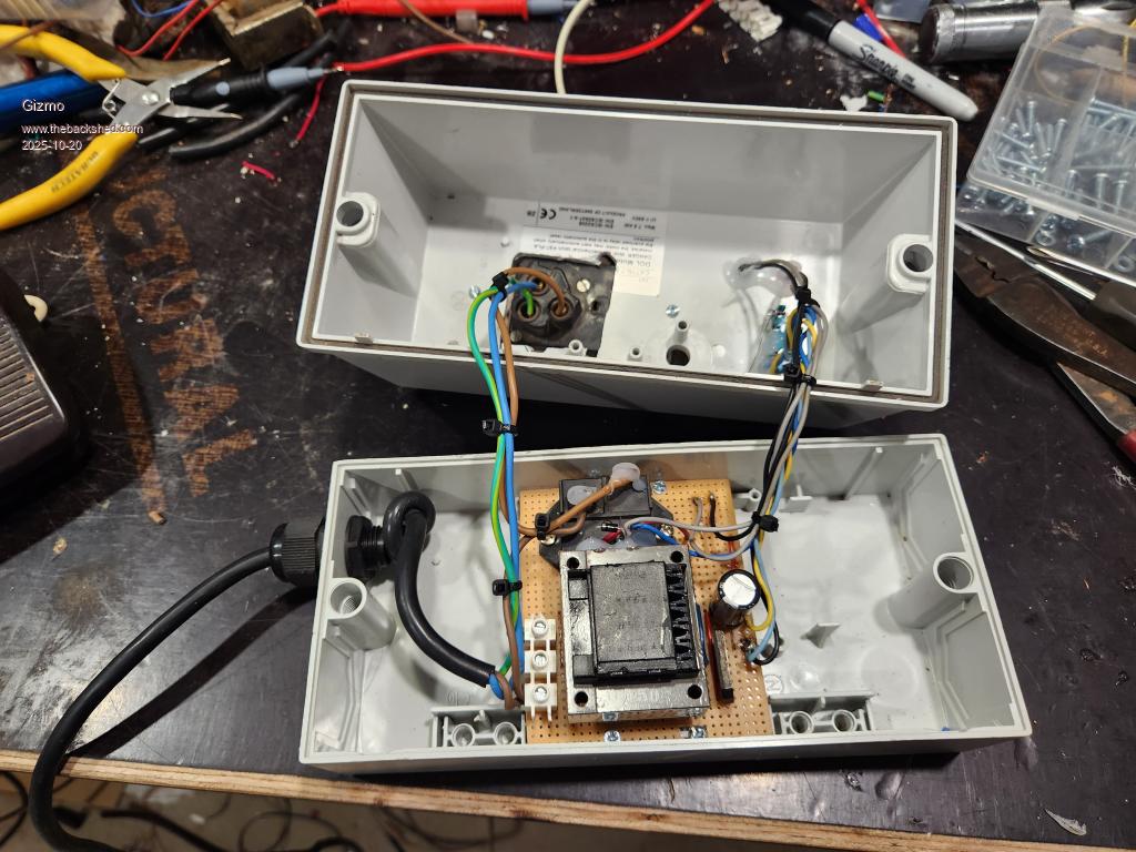 So decided to build a foot operated mains switch. I have a foot pedal for my TIG that I made from a old Singer sewing machine foot speed controller. This had a D9 plug on it where it goes into the TIG box. I made a simple circuit using a step down transformer, bridge, cap, couple LED's, and a 20 amp mains rated relay.