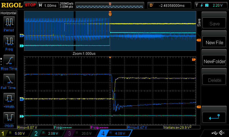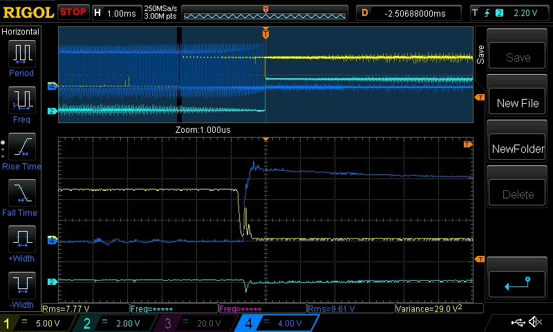 here is a detailed look at high side switch on, this time with 2 470pF parallel across gate and source. this is nearly 1nF.