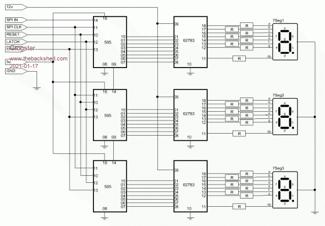 Basically, the 595's drive the 62783's, which then drive the large LED common-cathode displays using a 12v LED display voltage.  Value of R yet to be determined.