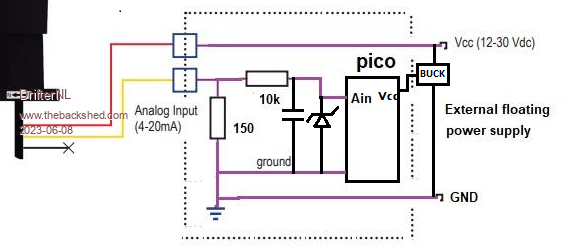 Hello all, Is my thinking correct? If I want to read out a sensor (that needs 12V) with an output of 4 - 20mA and convert that into 0.64 to 3.2V for an ADC on the Pico, all I would need is a 160Ω resistor between the output and common gnd? And would it be a good idea to place a capacitor between adc and gnd to filter out any interference (voltage spikes) to protect the pico adc port? Floating Point Keeps Sinking Me! Back To Integer So I Don't Get Injured. |