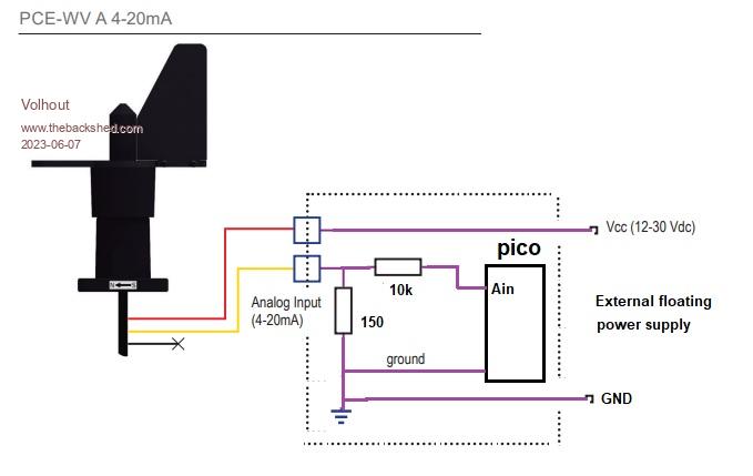 The device I'm looking into is the PCE Instruments PCE-WV A 4-20mA. Link to Manual The problem is I would like to connect the wind vane and Pico(with a buck converter) to one 12V power source. If not feasible I'll keep searching for another wind vane. Floating Point Keeps Sinking Me! Back To Integer So I Don't Get Injured. |