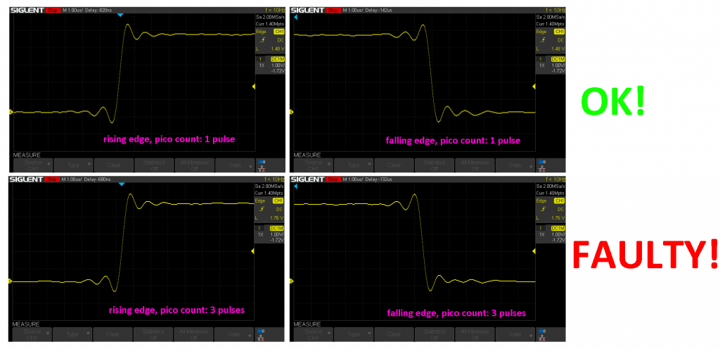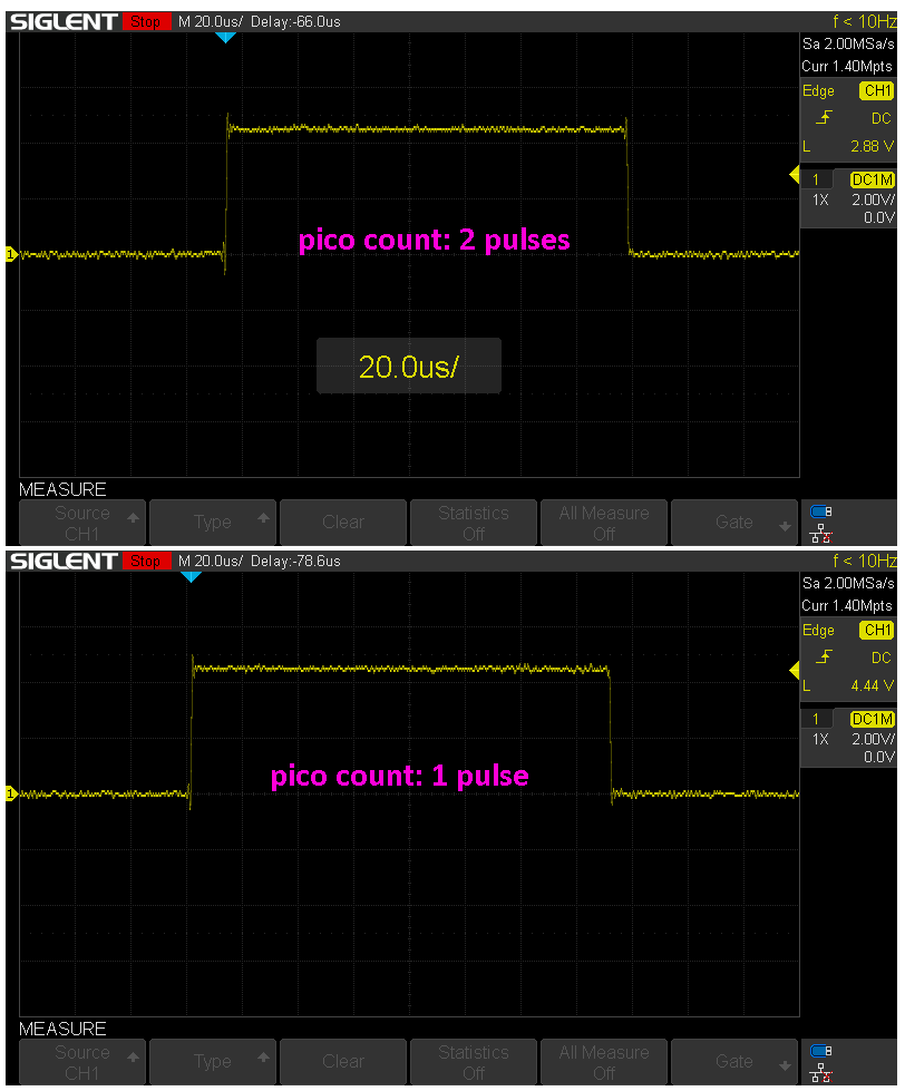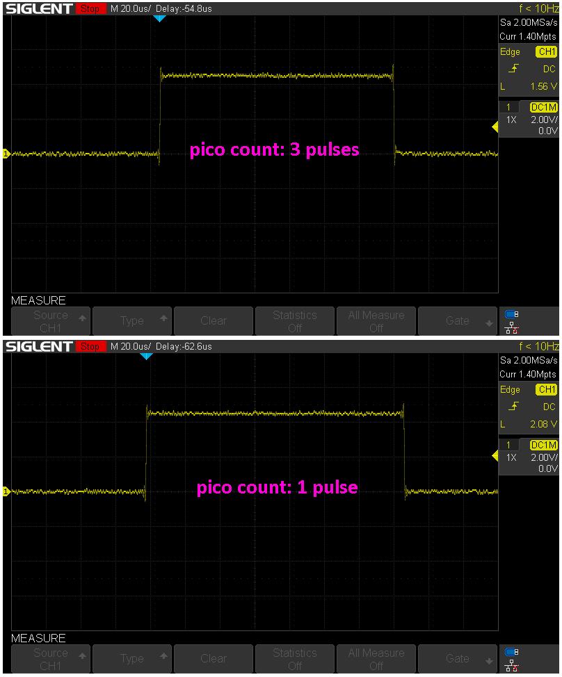 Hello Peter, I've done some measurements but can't really tell a difference. I comparead in real time with the pico reading, the scope was parallel. In every case the count SHOULD BE 1, not more. ![]() ![]() |