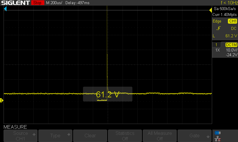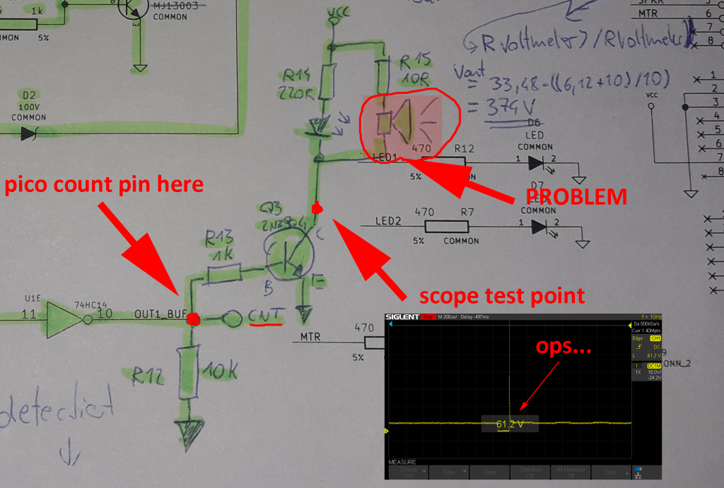 Finally I found the main problem and I hope you can lern from my dumb ideas.... First of all: Peter must have been right (like in 99,9% of cases) something "confused" the pico, on the count pin my scope was attached I cannot see anything strage (se post above).. there must be some noise or interference, ringing whatever.. so I took a close look at my schematic and measured at collector of transistor Q3 of my own drawing: ![]() closer look at scope: ![]() Problem part is the buzzer, when active (and only when active!) there are transients way above 50 volts at collector of Q3! This causes the problem, this is the root of all evil. By disconnecting the buzzer (not a piezo one!) no parallel capacitor needed and no double countings anymore. Since this is an inductor it explains this peak in voltage and it may send and interfere with the pico. Problem solved. Maybe someone find this entertaining, at least I am a bit wiser now Greetings and thank you all for suggestions! Daniel |