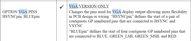 Per the Picomite manual for setting alternate VGA pins: ![]() Would this apply to the upper pins of this module, e.g., GP27, 28, 29, 30 for blue, green1, green2, and red? ~ Edited 2026-02-08 04:41 by lizby PicoMite, Armmite F4, SensorKits, MMBasic Hardware, Games, etc. on FOTS |
