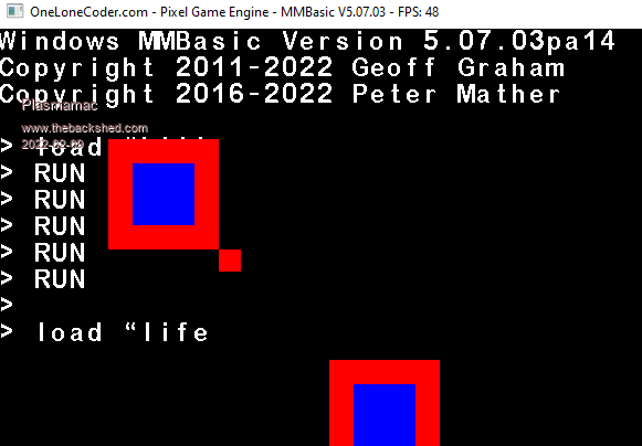 Hi after : Box 100,100,100,100,22,RGB(red),RGB(blue) Blit 100,100,300,300,100,100 Blit read 1,100,100,20,20 Blit write 1,200,200 the next command will crash *load *new etc ![]() Edited 2022-02-09 02:33 by Plasmamac Plasma |