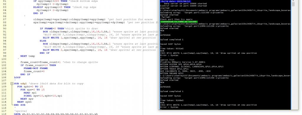 Dear Peter, The PETSCII team is trying to make the game compliant with both LCD and VGA. In that effort they are using the "FRAMEBUFFER WRITE sc$" where sc$ is either N or F, depending on the platform. When running PicoMiteVGA 50708RC12, the command FRAMEBUFFER WRITE sc$ gives a syntax error when sc$="N" or "n". I tried the latest PicoMiteVGA 50708RC14, and the same happens. I am not sure the command is correctly implemented in picomite VGA. Can you confirm? Thanks, Volhout PicomiteVGA PETSCII ROBOTS |