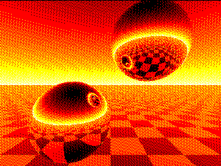 Spheres ![]() MODE 2 Map(1)=RGB(Red) Map(2)=RGB(Yellow) Map(3)=RGB(White) Map set For N=0 To 239 For M=0 To 319 X=0:Y=-.1:Z=3 U=(M-159.5)/160:V=(N-117.5)/160 W=1/Sqr(U*U+V*V+1):U=U*W:V=V*W I=Sgn(U):G=1 Do E=X-I:F=Y-I:P=U*E+V*F-W*Z D=P*P-E*E-F*F-Z*Z+1 If D>0 Then T=-P-Sqr(D) If T>0 Then X=X+T*U:Y=Y+T*V:Z=Z-T*W:E=X-I:F=Y-I:G=Z P=2*(U*E+V*F-W*G):U=U-P*E:V=V-P*F:W=W+P*G:I=-I Loop EndIf EndIf If V<0 Then P=(Y+2)/V:V=-V*((Int(X-U*P)+Int(Z-W*P)And 1)/2+.3)+.2 EndIf Color Map(3-(48*Sqr(V)+(7*(M+4*N))Mod 16)\16) Pixel M,240-N Next Next |