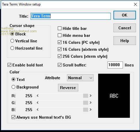 Thanks for the reports The issue was that the program was being run twice when F2 was used to exit the editor. This was another consequence of the merge of Micromite and Maximite code that I use in the Pi-cromite: Mostly Micromite but Maximite for program memory handling as the code isn't stored in flash. Anyway: trivial one line change so I haven't updated the version number 2017-05-07_072013_mmbasic.zip Jim: I don't know why you aren't seeing colour in Teraterm. This is my configuration ![]() ctrl-Z (and ctrl-C) is/are being trapped by the program and it does do a full exit in response to ctrl-Z. I am not using the pigpiod daemon as this has limitations which would not work for the Pi-cromite. The pigpio code is linked into the Pi-cromite code. This is why you can only run one instance of the code running. I will look at having an option setting that defines which pins the Pi-cromite takes over but the current approach is that the Pi-cromite takes over all I/O in the range gpio2 - gpio31 |