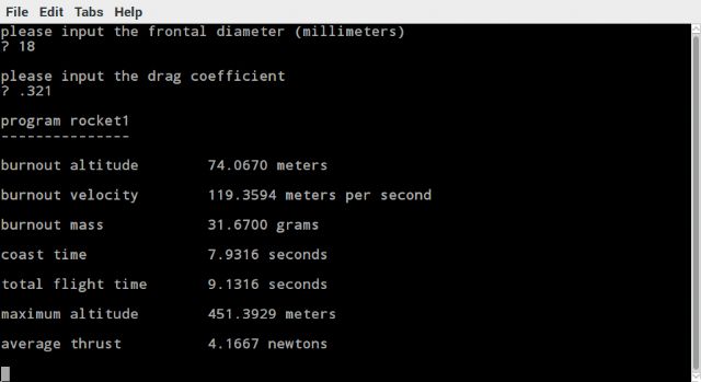 This post talks about capturing screens using Peter's implementation of the SYSTEM command on the Raspberry Pi. First install scrot using the following sudo apt-get install scrot Scot is a utility for capturing screenshots. Its use via the SYSTEM command is illustrated in this Raspberry Pi version of the rocket1 MMBASIC program posted earlier. The following line of source code captures the "active" screen and saves it to a file named rocket1.png. system "scrot -u rocket1.png" Here's the screen capture image. ![]() Here's the slightly updated source code listing. ' program rocket1_rpi.bas May 24, 2017 ' Raspberry Pi version ' determines flight performance ' of single stage model rockets ' altitude at burnout, meters ' velocity at burnout, meters per second ' coast time and total flight time, seconds ' maximum altitude, meters ''''''''''''''''''''''''''' option default float dim altsite, tempsite, tduration, impulse, massi, mprop, fd, cd ' surface gravity (meters/second^2) const gravity = 9.80665 ' sea level atmospheric density (kilograms/cubic meter) const rhosl = 1.22557 print " " print "program rocket1" print "---------------" do print " " print "please input the launch site altitude (meters)" print "(sites above sea level are positive, sites below sea level are negative)" input altsite loop until (abs(altsite) >= 0.0) print " " print "please input the launch site temperature (degrees fahrenheit)" input tempsite do print " " print "please input the thrust duration (seconds)" input tduration loop until (tduration > 0.0) do print " " print "please input the total impulse (newton-seconds)" input impulse loop until (impulse > 0.0) do print " " print "please input the initial mass (grams)" input massi loop until (massi > 0.0) do print " " print "please input the propellant mass (grams)" input mprop loop until (mprop > 0.0) do print " " print "please input the frontal diameter (millimeters)" input fd loop until (fd > 0.0) do print " " print "please input the drag coefficient" input cd loop until (cd > 0.0) ' convert mass to kilograms and diameter to square meters massi = 0.001 * massi mprop = 0.001 * mprop fd = pi * fd * fd / 4000000.0 ' compensate for launch site altitude and temperature rho = rhosl * density(altsite) / (1.0 + (tempsite - 59.0) / 518.67) ' determine altitude performance thrust = impulse / tduration mass = (massi - 0.5 * mprop) k2 = 0.5 * rho * fd * cd weight = mass * gravity b = tduration * sqr(k2 * (thrust - weight)) / mass c = exp(b) d = exp(-b) e = 0.5 * (c + d) f = (c - d) / (c + d) ' calculate burnout conditions altbo = (mass / k2) * log(e) velbo = f * sqr((thrust - weight) / k2) massbo = massi - mprop weightbo = massbo * gravity ' compute coast conditions tcoast = sqr(massbo / (k2 * gravity)) * atn(velbo * sqr(k2 / weightbo)) altcoast = (massbo / (2.0 * k2)) * log(k2 * velbo * velbo / weightbo + 1.0) ' calculate total flight time and maximum altitude tflight = tduration + tcoast altmax = altbo + altcoast ' print results print " " print "program rocket1" print "---------------" print "burnout altitude ", str$(altbo, 0, 4) + " meters" print " " print "burnout velocity ", STR$(velbo, 0, 4) + " meters per second" print " " print "burnout mass ", STR$(1000.0 * massbo, 0, 4) + " grams" print " " print "coast time ", str$(tcoast, 0, 4) + " seconds" print " " print "total flight time ", str$(tflight, 0, 4) + " seconds" print " " print "maximum altitude ", str$(altmax, 0, 4) + " meters" print " " print "average thrust ", str$(thrust, 0, 4) + " newtons" print " " pause 1000 ' save screen image system "scrot -u rocket1.png" end '''''''''''''''''''''''''' '''''''''''''''''''''''''' function density(x) as float ' atmospheric density function ' input ' x = altitude (meters) ' output ' density = atmospheric density (kilograms/cubic meter) '''''''''''''''''''''''''''''''''''''''''''''''''''''''' density = (1.0 - 0.000022556913 * x) ^ 4.256116 end function |