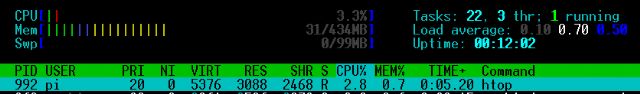 Hi Not sure if anything can be done about this but thought I would ask High CPU on Pi Zero 1.3 and W Test platform has Jessie Lite (No GUI) See the screen shots below first one with out mmbasic running Second one with mmbasic loaded and NO mmbasic program running Regards Jman |