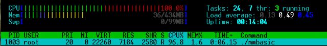 Hi Matherp! The first message of this post shows the result of the test. On RPi3B I got the same results. On RPi zero w, the result is comparable to MMX 200 MHz. The result varies greatly with subsequent launches. After running mmbasic on RPi zero W, the CPU load is constantly equal to 100% without running the basic programm. |