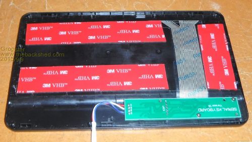 It is hard to see, but there is a slice of OHP film taped down over the top of the PCB, to prevent it shorting out on the aluminium base-plate. 3M VHB tape is remarkable stuff, and by God, it sticks. I have used it for many a mounting, and it has never let me down, and this looks much neater then drilling new holes right through the case. The plate is 3mm aluminium, cut by a local firm, using the flappy original "Plate" as a template.