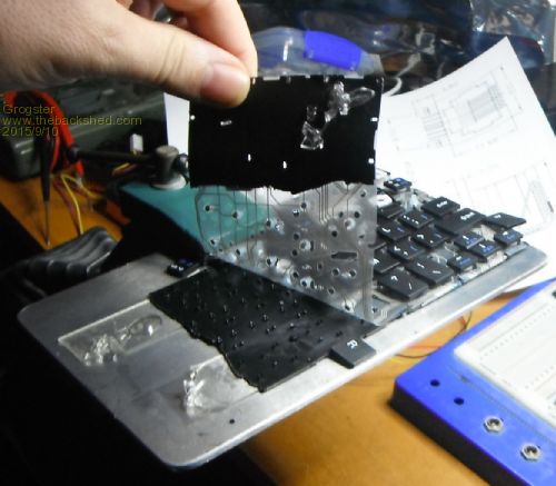 I used CRC 2016 Contact Cleaner to clean down the surface of the new aluminium plate first, then lower gently into place, and press down. Last image shows the finished prototype sitting on one of those foam-rubber mat-anchor-securing-sheet-stuff. I don't know it's proper name, but people put it under normal keyboards to stop them moving, and it is also common in cars for people to plop their cellphone on to stop it sliding off the dash. I had green, but you can get it in black among other colours. With it sitting on this stuff, it is solid as a rock. Smoke makes things work. When the smoke gets out, it stops! |