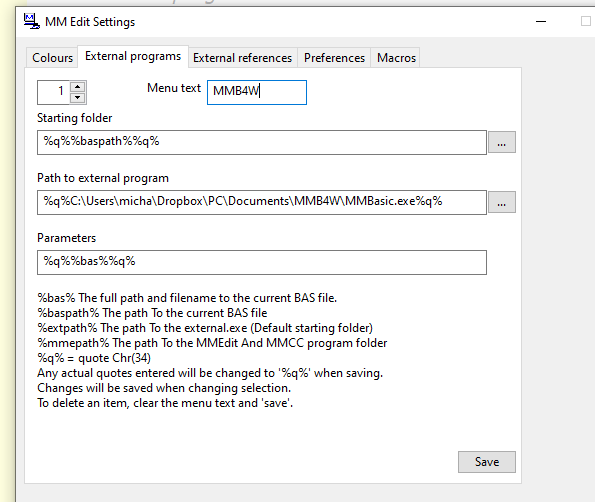 There is one obvious difference between the direct link to MMB4W and Gerry's MMReplace method. Gerry sends commands to the open MMB4W window so there will be only one copy open. My direct link will always start a new instance of MMB4W so you can end up with a large stack of instances if you don't QUIT them. The MMEdit help has the instructions for linking. Basically the same as provided by Craig. If you click on the button "Set as default" (not shown on Craig's image), You can use the "Run in DOS" button to launch MMB4W . The tooltip text will have changed to indicate the default program it launches. Saves opening the menu. Jim VK7JH MMedit |