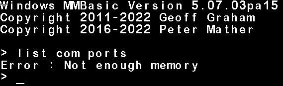 @Michal Yes, it's been thought about. There was a Raspberry Pi version some time ago but, because of the frequent changes made to the Pi's OS, it became impractical to support it. AFAIK there are no plans to work on any versions specifically for the Raspberry Pi boards now. https://www.thebackshed.com/forum/ViewTopic.php?TID=14155&PID=177329#177329#177329 ======================= Back on topic: I love all these COM ports. It appears I have 7571644 of them and Not enough memory. :) System is Windows 10 Pro 64 Build:21H2 Intel(R) Celeron(R) CPU N3450 @ 1.10GHz 1.10 GHz 4GB RAM Edited 2022-02-12 22:34 by Mixtel90 Mick Zilog Inside! nascom.info for Nascom & Gemini Preliminary MMBasic docs & my PCB designs |