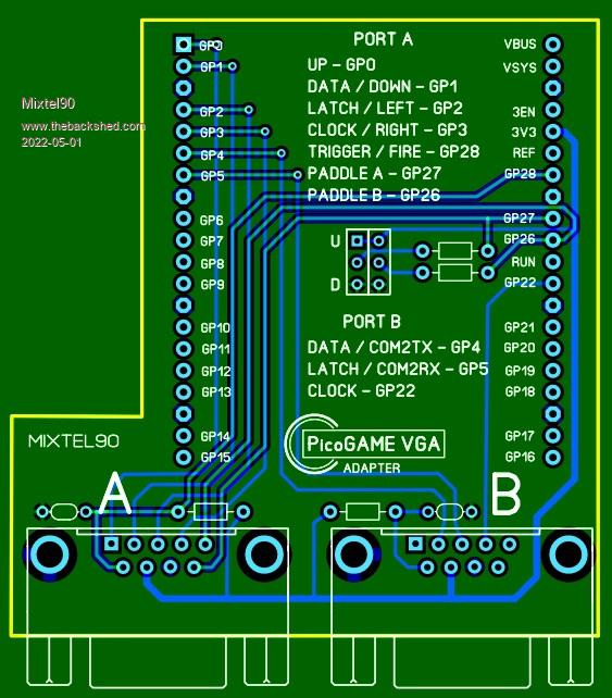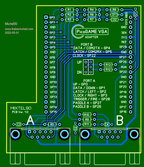 Mick, Wow - thanks for the Pico Game VGA adapter board. Looks like another board I’ll need to build. I’m looking at Peter’s VGA board and it looks like the reset button is obscured by your game adapter board. Not a big deal, as I haven’t needed to use it yet. One thing you may want to adjust is the board profile around the notch. I can’t tell for sure, but it looks your board may contact IC2 on Peter’s board. You may want to trim the board where ‘Mixtel’ is on your board. Thanks for answering on the trigger. On your schematic notes for the 1.4 board, you mention JS1 trigger is GP14, not GP15. |