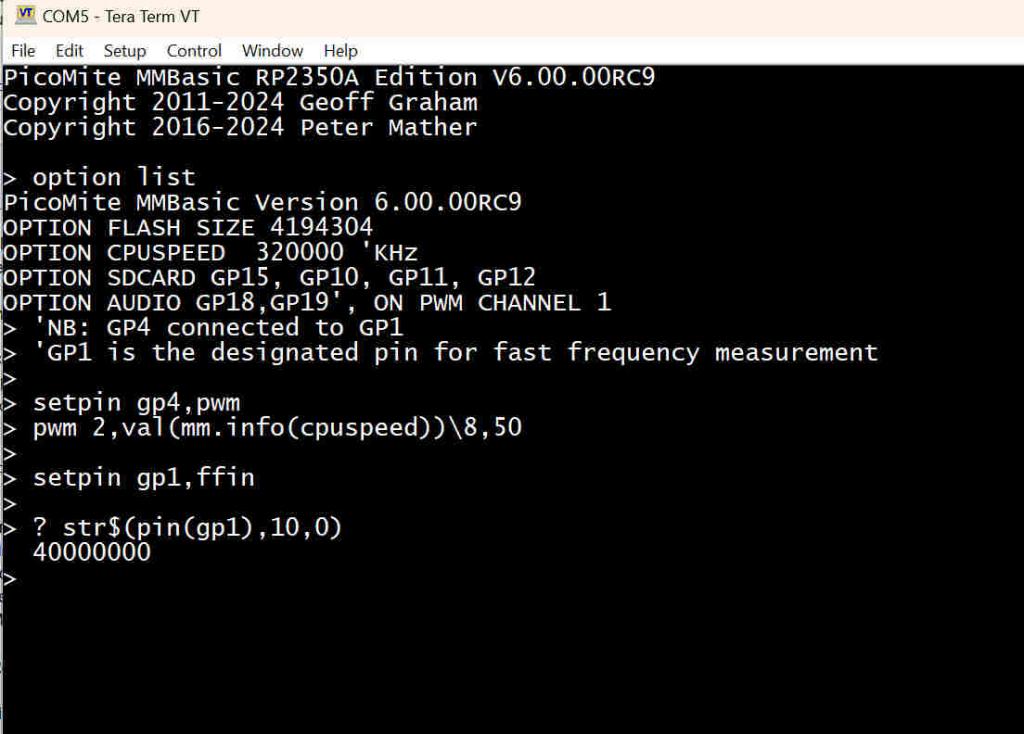 I'm supposed to be documenting but this seemed like more fun ![]() This will only be available on the RP2350 Here is just the standard PicoMite version if anyone wants to play with it. The fast frequency functionality is fixed on pin GP1 and uses PWM channel 0 to do the counting. I've tested up to 50MHz using an external signal generator. I think the theoretical limit is CPUSPEED/4 but can't get a good enough signal to test at those rates PicoMite.zip Edited 2024-10-20 01:40 by matherp |