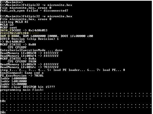 (When I say it's SLOW... I mean S-L-O-W.) It's fine to kill it any time and restart, though another erase might be a good idea. Looks like worst case to undo the driver tweak you can follow this Which basically removes what was added so Windows can go back where it was. I'm wondering about putting my code into a umite i.e. making a HEX file that can be flashed into a umite (slowly, if it's done this way) and then the umite can be used as the programmer from then on. I'd rather MOBI's code be used, though, as that way MMBasic can be used to flash PIC32s, even if the very first board a new user creates uses my slow stuff. John |