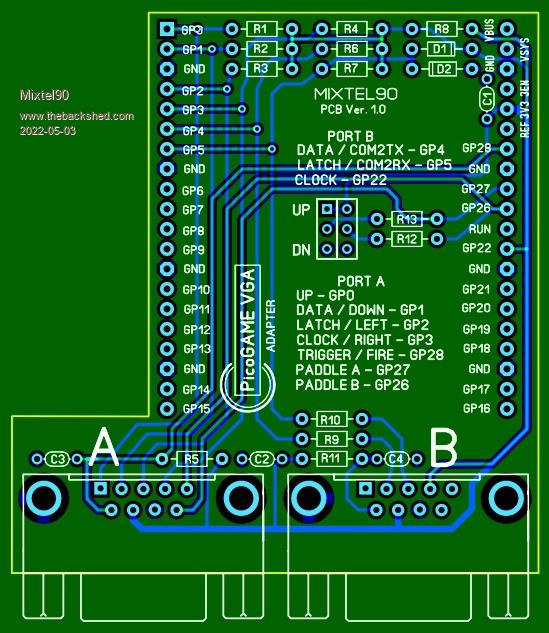 Try this... PicoGAME Adapter 00 gerber.zip Edited 2022-05-03 23:24 by Mixtel90 Mick Zilog Inside! nascom.info for Nascom & Gemini Preliminary MMBasic docs & my PCB designs |