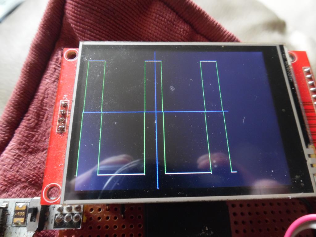 NPH . I looked at your old trigger and changed mine and it seems more stable! a rising edge but my display and 0,0 at top left. using ili9341 with 0,0 at top left. Moving to bottom left 0,239-y each loop seems waste so turn display board 180 and print text upside down.. no :) adc start samples!() 'get new samples 'trigger c%=0 do:If samples!(c%+1) > 0.1 then if samples!(c%) < 0.2 then exit do inc c%:loop while c%<240 was If samples!(c%) > 0.1 then if samples!(c%+1) < 0.2 then exit do As an experiment I tried line in green then plot in white on top.. 2 tone square. for x%=0 to 238 'screen width line x%,239-samples!(x%+c%),x%+1,239-samples!(x%+1+c%),,rgb(green) 'draw new sample from sample(c%) pixel x%,239-samples!(x%+c%),rgb(white) 'plot new sample from sample(c%) next x% |