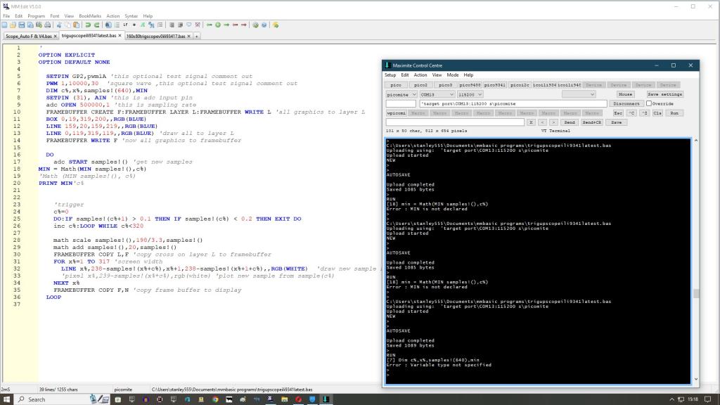 ??? The Math Function requires you to have the variable Low! but you can just ignore it and use index% as your trigger point for the display. Memory Copy can then be used to copy from that array Hres. values starting at index% to another array which you then display. Edit Perhaps something like this may work when added to your program. 'setup HRes = MM.HRes Dim float samples!(HRes * 2) Dim float display(HRes) disp.addr = PEEK(VARADDR display()) samp.addr = PEEK(VARADDR samples!()) 'main low! = Math(MIN samples!(),indx%) Memory copy FLOAT samp.addr + indx% * 8, disp.addr, HRes Then send display() to the screen. Nice one Phil but I'm not knowing your code yet. Another prob is the lowest val is element 600+ in a 640() array. cheers, stan |