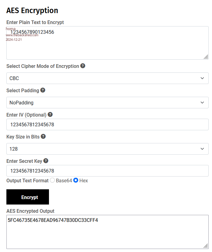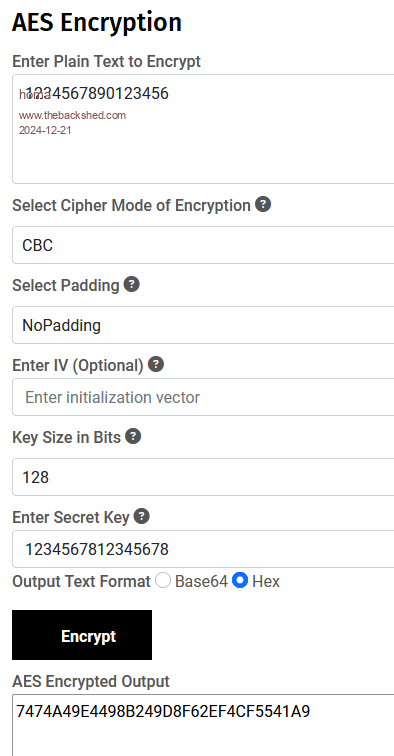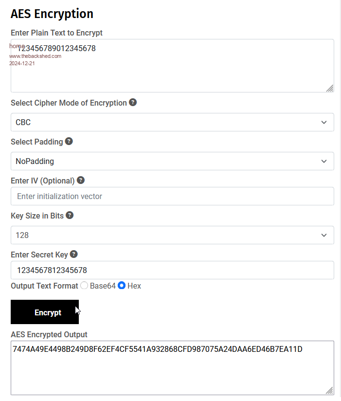 So many thing wrong You haven't set an initialisation vector and they seem to be assuming all zeroes - I don't Trying to print out$ can't work as it contains non-printable values. You would have to take each element in turn and HES$(asc(mid$( it And then somehow you have got the website to create a 32 byte output from a 16 byte input My way works ![]() ![]() Edited 2024-12-21 04:17 by matherp |
