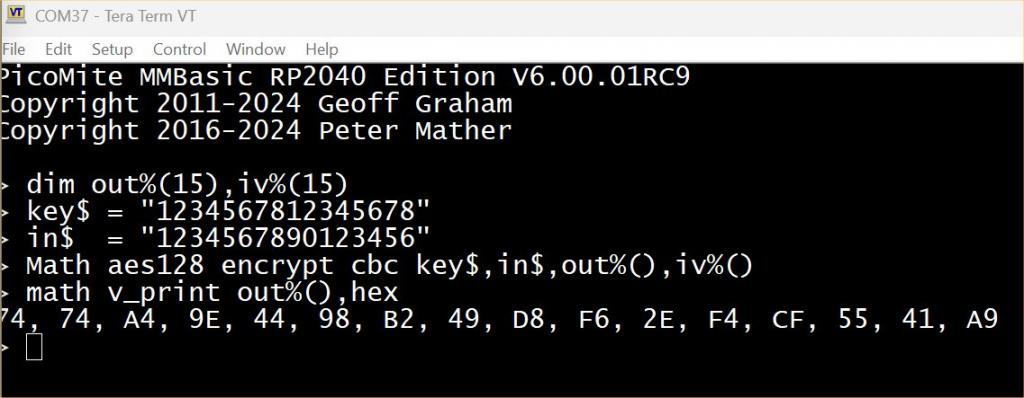 You are right, my first entry on the website was two characters too long. Here is the correct test1: > list 'TEST aes128 cbc ' Dim integer out2(15) out$ = "" key$ = "1234567812345678" in$ = "1234567890123456" iv$ = "1234567812345678" ' Math aes128 encrypt cbc key$,in$,out2(),iv$ Math v_print out2(), hex 'Print out$ > run 5F, C4, 67, 35, E4, 67, 8E, AD, 96, 74, 7B, 30, DC, 33, CF, F4 > ![]() But I don't understand this: ![]() > list 'TEST aes128 cbc ' Dim integer out2(15) out$ = "" key$ = "1234567812345678" in$ = "1234567890123456" iv$ = "1234567812345678" ' Math aes128 encrypt cbc key$,in$,out2() ',iv$ Math v_print out2(), hex 'Print out$ > run 5E, 62, B3, 27, 61, C7, 64, DE, 85, 6B, D, 3E, B6, 43, BF, E4 > On the website: Enter IV (optional) inizialisation vector And your description: For CBC and CTR versions you can optionally specify an initiallisation vector ‘iv’. ‘iv’ must be 16 elements long (16*8=128bits) Why is iv supposedly optional if it is required? Is there a default value that might be missing? Matthias |