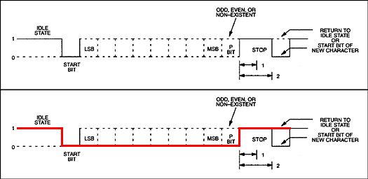 just had a look at the start and stop bit framing for RS232 data, and found the following:
